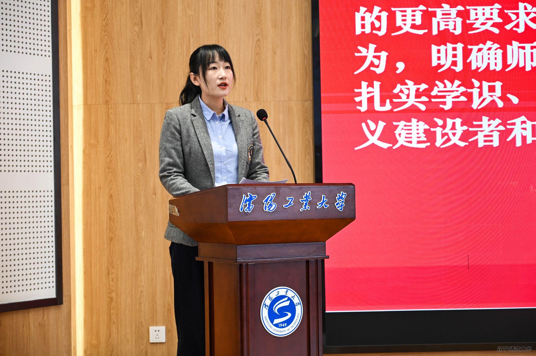 新入职教职工代表、信息科学与工程学院刘晴发言。她代表新入职教师领学《新时代高校教师职业行为十项准则》。